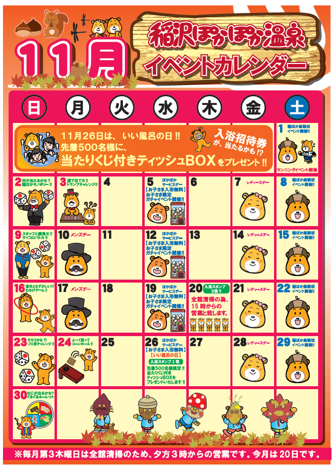 寒い持期になってまいりましたが、今月も稲沢ぽかぽか温泉は楽しいイベントを沢山ご用意しております!!!!